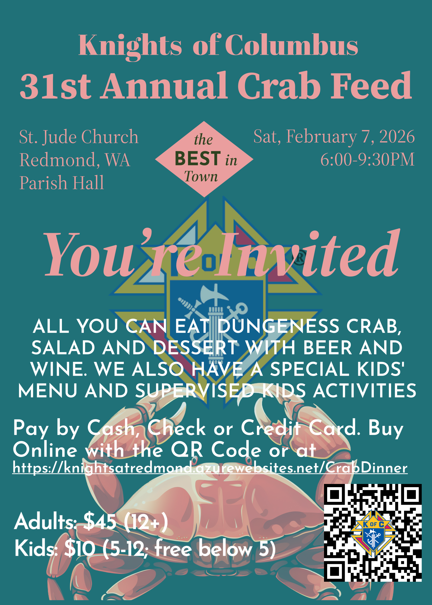 Fresh Dungeness Crab, Homemade Rolls & Salad bar, All beverages included.
